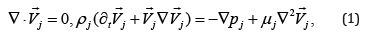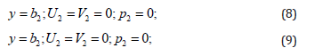 Where V = {U, V}is the fluid velocity field, p is the pressure, t is time, ∇ ≡ (∂x,∂y) , ρ - density, μ - dynamic viscosity and indexes, j = 1, 2, 3 are used for gas (vapor), top liquid and bottom liquid, respectively. Boundary conditions are following: tangential stresses supposed to be negligible at the gas – liquid interfaces, therefore