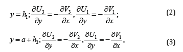 where b1>>h1, b2>>h2. The boundary conditions are linear in assumption that the long-wave small-amplitude perturbations of interfaces are considered. Boundary layer approximation may be applied for the thin gas layer. Then for gas flow p1=p1(x, t), and the momentum equation in y is omitted. Considering the instability of the interfaces one can integrate the equations (1) with boundary conditions (2)-(9) with respect to y and reduce the boundary problem (1)-(9) to the evolutionary equations for Then it is better to use a dimensionless form. The scale values are chosen as: a, U1, a/U1, p1U21 1 - for the length, velocity, time and pressure, respectively. It is considered that in the unperturbed state the layers move with constant velocities along x. Then dimensionless boundary problem (1)-(9) for perturbations is got in the following form: