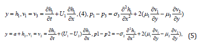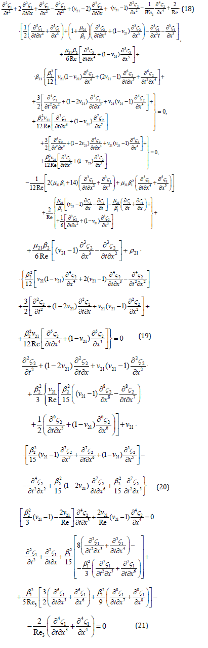 From (10)–(17), derivation of the evolutionary equations for oscillations of the boundaries of gas layer was done [9], with polynomial approximation of the transversal velocities in the layers. The following differential equations for the perturbations of boundaries of layers were obtained [9] as: