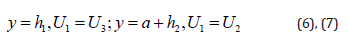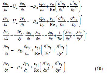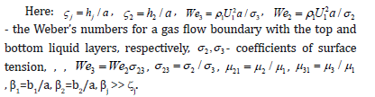 where the momentum equation for the gas flow is omitted because a boundary layer approach is adopted for it due to considered thin gas layer. Here Re =U1 a /ν1 - the Reynolds number for gas flow, ν - kinematic viscosity coefficient, ρ12 = ρ1/ ρ2 ,ρ13 = ρ1/ ρ3, ν21=ν 2 /ν1 ,ν 31 =ν 3 /ν1 , U21 =U2 /U1 . Here U21 characterizes the liquid to gas velocity ratio. Dimensionless boundary conditions (2)-(9) are