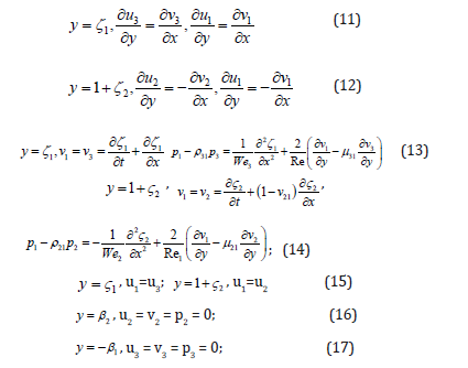 where hj(x,t) are small-amplitude perturbations of the interfaces of the gas flow layer. The balances of the normal stresses at the interfaces and the augmented kinematics condition are: