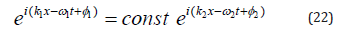 where j=1,2, i = −1 , x j – constants, the initial amplitudes of the perturbations, kj, wj- the wave numbers and frequencies of the oscillations, φj – the initial phases of perturbations. Afterward, substituting the obtained solution into the other two equations of the system, we can get dispersion equations for computing the frequencies of perturbations wj = wj (kj) depending on the wave numbers. The perturbations of the top and lower boundaries are interconnected and can differ only by the initial phases φj, k1= k2= k, w1 = w1 = w: