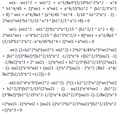 Here the values wr1, wi1, wr2, wi2 mean the real and imagine parts of the frequencies of perturbations. The argument x in the program means wave number k. The other parameters are: β1 = 10, β2 = 0.1 (thin gas layer), Re3 = 106, Re2 = 5·104 (Re2= Re· 21 v ), 21 v = 17.2 ·10-6. The results of numerical simulation with the above computer program are presented below in Figure 1 as the graphs for real (wr1, wr2) and imagine (wi1, wi2) parts of the w1, w2 versus the wave number k (x in figures):