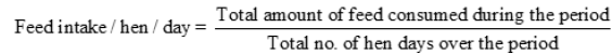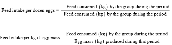 Group wise feed consumption per bird was taken at interval of each 2 weeks for 8 experimental periods and for cumulative 1 - 8 periods. The feed consumption per bird for each period from 22 - 38 weeks was calculated as below.