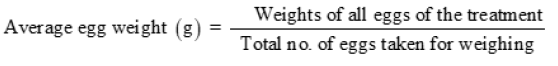 At the end of each week the egg weights were recorded. Egg weights were measured by using electronic weighing balance. Average egg weight of each treatment was calculated as under: