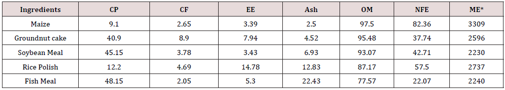 Feed ingredients used in the diet formulations were analyzed for the proximate nutrients [11]. The chemical composition of different feed ingredients is presented in Table 1.