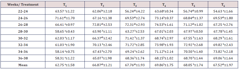 Table 4: Mean values of per cent hen day egg production during progressive age (weeks) under different dietary treatments.