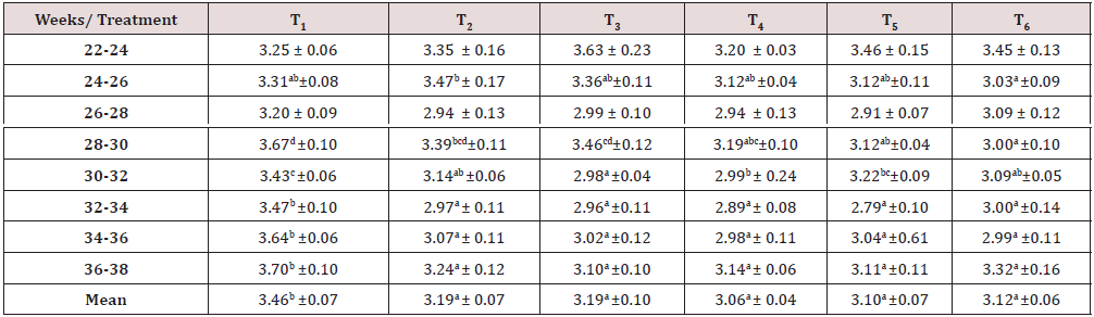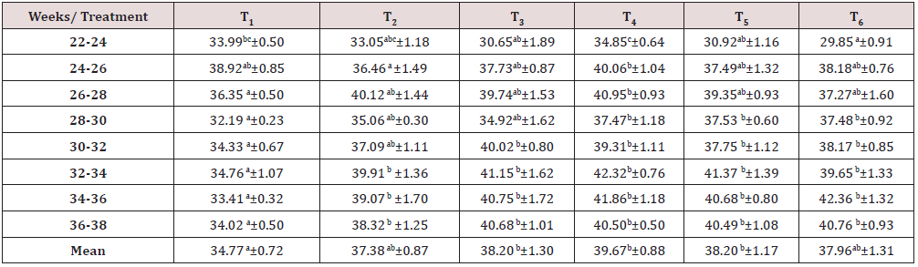 The data pertaining to average feed intake (g) per bird per day during progressive age of layers in different dietary treatments are presented in Table 3. The mean values of feed consumption of layers from 22 to 38 weeks of age were 119.98, 118.81, 120.67, 121.00, 117.66 and 117.74 g per bird per day in treatment groups T1, T2, T3, T4, T5 and T6, respectively. The results of the study depicted that there was no significant (P<0.05) difference among different dietary treatments, showing that feeding of different levels (0.25%, 0.50%, 0.75% and 1%) of turmeric powder did not affect feed consumption (g/hen/day). The mean value of feed consumption was minimum in T5 and T6 and maximum in T4. Feed intake during week 22-24 was maximum in T4 treatment followed by T1, T3, T2, T5, and T6 and significant (P<0.05) difference among treatments T5 and T6 was observed as compared to T1, T2, T3 and T4. Study during experiment showed that during 3 periods (22-24, 24-26 and 26-28 week) feed intake decreased significantly (P<0.05) in treatment groups T5 and T6 as compared to T1, T2, T3 and T4. During periods (28-30, 30- 32, 32-34, 34-36 and 36-38 week) there was no significant difference in feed consumption among different treatment groups. Thus, it can be concluded that dietary supplementation of turmeric powder at different levels has no effect on feed intake.