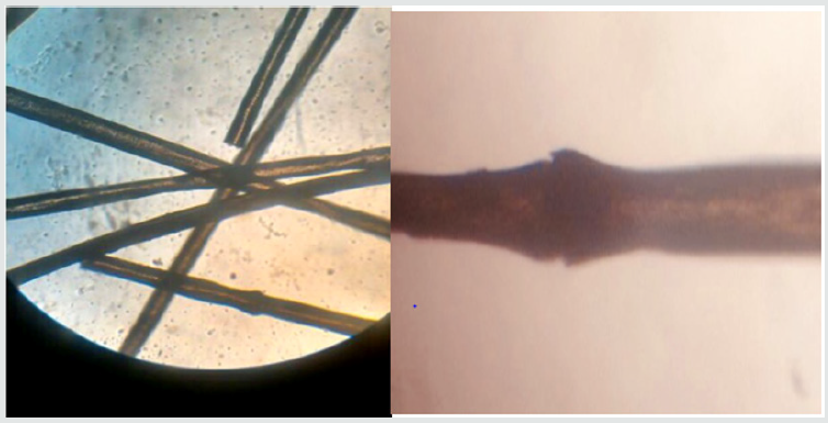 We declare that all the precepts of Bioethics were fulfilled in the present case report, including with the signature by the patient of Term of Free and Informed Consent. Male patient, born in Barreiras - BA, 40 years old, with a history of skin eruption from birth, complained of “fine and brittle hair”, scaling in the body, diffuse erythema of the skin, accompanied by pruritus, with temporary improvement when treated with topical corticosteroids and various antimicrobials. Dermatological examination revealed desquamative areas and diffuse erythema on the trunk, with serpiginous squamous plaques, as well as annular lesions and erythematous plaques on hands (Figures1 & 2). She had thin, opaque, rarefied and thin hair and eyebrows (Figure 3). Examination of the capillary rods under optical microscopy (100x) revealed tricorrexe invaginata (Figure 4). The histopathological picture was non-specific, with moderate epidermis and regularly thickened by acanthosis and elongation of the interpapillary ridges, hypergranulosis with stratum corneum replaced by parakeratosis, sometimes continuous. In the papillary dermis, dilation of the blood and lymphatic vessels with mild perivascular lymphocytic infiltrate was observed. Dermis reticular and hypodermic unchanged. It may, however, correspond to the Netherton syndrome (NS). In view of such findings, the diagnosis of (NS) was closed, and Acitretin 25mg daily was instituted in a single dose, and an important improvement was observed in a period of one month, and there was also a report of decreased pruritus and erythema . It was also reported a subsequent growth of eyebrows and hair. Clinical and laboratory evidence indicates that Acitretin, because it is derived from vitamin A and belongs to the retinoid group, shows a satisfactory action when applied in keratinization disorders. It is therefore frequently used in the ichthyoses in general. Thus, the benefits are evident, with a significant reduction in the indexes of desquamation, in the reduction of the scales, and in a greater skin elasticity [1-5].