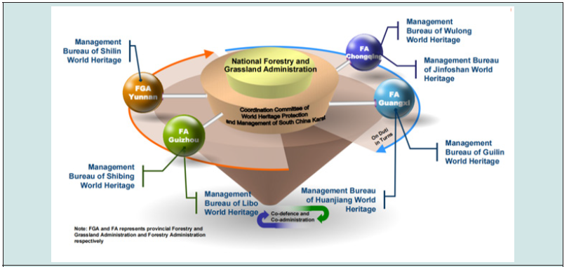 The South China Karst set up a good example of collaborative co-management, representing National Administration - Transprovince Coordination Committee-Site management Model. The national department responsible for the World Natural Heritage is the National Forestry and Grassland Administration, which is mainly responsible for guiding the draft laws, regulations and departmental rules of the South China Karst World Natural Heritage, formulating relevant policies, plans and standards and organizing their implementation, organizing and carrying out resources survey, protection and construction, ecological restoration, monitoring and evaluation. Coordination Committee of World Heritage Protection and Management of the South China Karst was set up to coordinate the protection and management of seven sites [10]. The Chinese Academy of Forestry, a comprehensive, multidisciplinary and public welfare national research institution directly under the State Forestry and Grassland Administration, assists in the protection and management of heritage sites. The secretariat of the Coordination Committee of World Heritage Protection and Management of the South China Karst is set in the Ecology and Nature Conservation Institute of the Chinese Academy of Forestry, and is responsible for coordination and management. Each provincial Forestry and Grassland Administration, including Phase I and Phase II, together coordinates and an on duties in turn mechanism. These authorities in turns (every four years) organize evaluation and provides suggestions on implementation of protection and management. They meet at least once a year. Management Bureau of each component of the South China Karst World Natural Heritage was set in in the City (County) where the property is located to manage the Properties directly. Since Libo Karst and Huanjiang Karst are completely contiguous, a joint Codefence and Co-administration mechanism has been set up within Libo Karst and Huanjiang Karst for coordinated management.