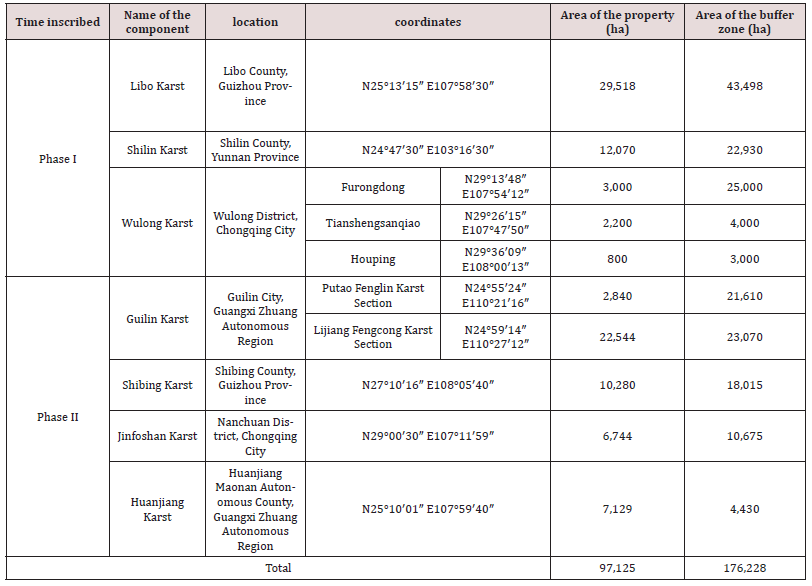 The South China Karst is a serial world natural heritage that was submitted in two phases by China to the World Heritage Committee of UNESCO. Phase I properties were inscribed on the World Heritage List in 2007, comprising three components: Shilin Karst (Yunnan), Libo Karst (Guizhou) and Wulong Karst (Chongqing). The Phase II comprises four components: Guilin Karst (Guangxi), Shibing Karst (Guizhou), Huanjiang Karst (Guangxi), and Jinfoshan Karst (Chongqing). The World Heritage Property is a serial property that includes seven karst clusters in four Provinces. The total area is 97,125 hectares, with a buffer zone of 176,228 hectares. The property contains the most spectacular, scientifically significant and representative series of karst landforms and landscapes of South China from interior high plateau to lowland plains.