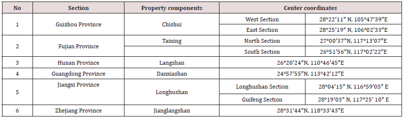 China Danxia is a serial world natural heritage property comprising six components found in six provinces of China including Chishui Danxia in Guizhou Province, Taining Danxia in Fujian Province, Langshan Danxia in Hunan Province, Danxiashan in Guangdong Province, Longhushan in Jiangxi Province and Jianglangshan in Zhejiang Province. China Danxia is unrivaled in its rich warm and humid climate red-beds sandstone landform geomorphologic features characterized by spectacular red cliffs and a range of erosional landforms, including dramatic natural pillars, towers, ravines, valleys and waterfalls. China Danxia is also noted as a natural aesthetic landscape comprising red rocks, green vegetation, blue water and white clouds [6,7].