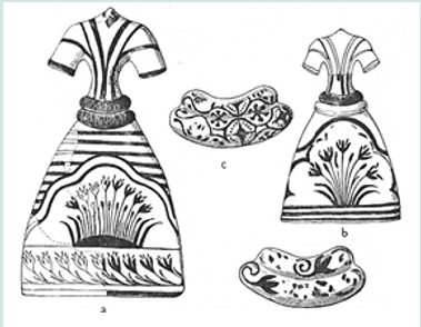 On the North wall, in the center of the representation, an imposingly female figure is seated on a raised scalene construction. She wears impressive jewelry and is flanked by an ape that tends his hand offering to the figure a bouquet of crocus and a griffin. The female figure can certainly be characterized as goddess, as she has a central place in the composition, her scale is higher of that of the others, she stands at a higher level, the offerings come to her and she is flanked by the griffin, the holy protector [7], and the ape (for the role of the apes see) [23]. She has been characterized as the Goddess of Nature [20-30] and yet possibly with a virginal substance, which it is concluded on the basis of the very young age of the girls that are shown to take part in the crocus gathering [31]. The parallelism of the figure with Artemis of the classical years has been underlined as well [31-32]. Behind the ape another female figure empties crocus from her basket in another bigger basket. The baskets, according to a certain point of view, had typical dimensions i.e. they contained the same number of flowers, so that the standardization of the production could be possible [33]. Let’s remember that additional indications of crocus offerings to a goddess are the dress plaques from faience (figure 2) from the Temple Repository [3, 5,34].