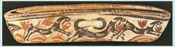 The symbolic character of the crocus is confirmed by its presence in special categories of pottery, as strainers, rhyta, kymbai (Figure 4), double vases, and a clay table of offerings [20]. The presence of crocus on them indicates that “an examination of the ceramic material shows that the crocus (and the pendant-petal motif)... not only can be linked with sanctuaries and cult but that these motifs were chosen for vessels intended to be used for ritual purposes” [43].