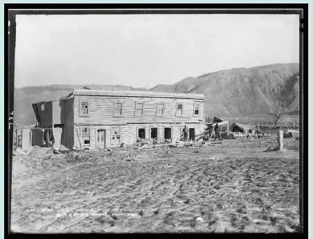 Figure 3: McRae’s Rotomahana Hotel following the eruption. The figure on the far end of the verandah is where the occupants would have left for Sophia’s house (Te Papa MA1043618).