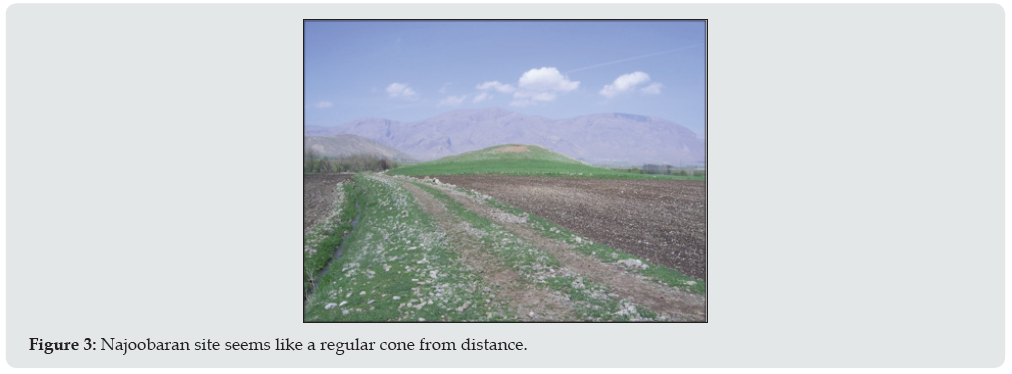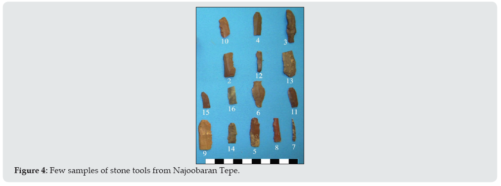 The altitude of this site is 1508 m and is located the eastern side of Najoobaran village. The length and width of this site is 75*90 and its height from the surroundings is 10m. The site attracts attentions with its regular cone shape from distance (Figure 3). Due to the existence of Najoobaran spring as the source of Dinvar river near, this site is turned into a settlement area of Dinvar basin. Here in addition to Neolithic wares, a set of stone tools made of flint were obtained. This set includes Microlith and blades in which the used stone resources are approximately of one type of high quality radiolarites in the color of Brown, light brown and different hues. In this set of 15 tools, 7 has denticulated retouches, notch and retouches made as the result of being utilized and others in the set lack these retouches. In some of the cases, notched retouches are in reverse in surface with microlith shape. Regarding the symmetric edges and the previous removal level, it seems that microlith are produced by pressing method in this site [17,18; Figure 4).
