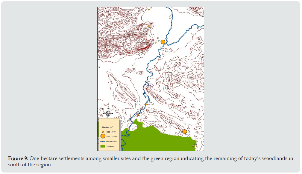 Figure 9: One-hectare settlements among smaller sites and the green region indicating the remaining of today’s woodlands in south of the region.