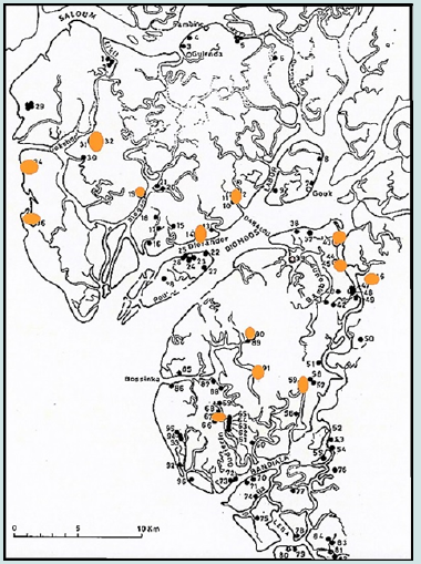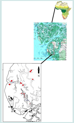 The Saloum estuary, located between Joal in the north and the Gambia River in the south, is an original mangrove environment traversed by multiple arms and tidal channels called Bolon in local wolof language. The delta stricto-sensu is located between 13o 40' and 14o 20' north latitude. The Saloum estuary was an open bay around 4000 years BCE. It was gradually filled in by sediments deposited by the Saloum River, with a geomorphological configuration close to the current situation reached between 2000 and 1500 BP [1]. The last aggradation phase took place between 1500 and 600 BP. The mangrove, so characteristic of the delta landscapes, essentially comprises three species: Rhizophora mangle, Avicennia nitida, and more rarely Rhizophora racemosa. The shell middens as well as old and current villages are colonized by Adansonia digitata (baobabs), with in some cases oil palms (Elaeis guineensis). The herbaceous layer is made up of bands of different species depending on the salt content. “The borders are populated by halophile (Sesuruma), the sandy soils with little salt concentrate the Andropogonae. The dominant soils under mangroves are acid sulphate soils whose acidification is due to the oxidation of sulphides” [2]. The Saloum delta, which covers an area of more than 2,500 square kilometers, has three main arms, the Saloum in the north, the Diombos in the center, and the Bandiala in the east. These three large rivers are linked to each other by an extremely dense network of braided channels, the bolons. The delta has two large groups of islands separated by the Diombos, the islands of Gandoul to the northwest and the islands of Betanti to the southeast, with the islets of Gouk and Poutak in the Diombos. Cockles and oysters are still exploited today but less intensively than in the past [3-8]. The shell middens that make the Saloum Delta special are majestic for some and without comparison with the neighboring regions near or far. This is indirectly the indication of a particularly rich biotope, a biodiversity reserve, part of which has been erected as a national park of the Saloum delta listed as world cultural heritage and biodiversity reserve.