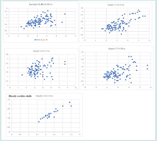To probe the causes of changes in the shellfish population represented in some of the tested shell middens, more or less equal size shell samples were collected at Oudierin - Boumak in a 2.00 m thick sediment deposit, every 10 cm along the human-made deposit. The samples were sorted in the laboratory and complete shells-at least 100 per sample - of all represented species were selected for further measurements, essentially width and length. The analytical rationale is anchored on shellfish – here bloody cockle and oyster – biology and growth patterns. In West Africa, bloody cockle lives generally in the top 5-10 cm layer of sandy mud or mud of lagoons and estuaries [14]. Their maximum length ranges between 100 and 150 mm. Mangrove oysters are seasonal breeders in estuaries and continuous ones on lagoons, with size at maturity ranging from 8 mm for male and 10 mm for female. There are however, many factors that may influence shellfish size. “Water temperature, salinity, turbidity, nutrient availability, species population density, and overall community composition all affect intertidal molluscan growth rates and may contribute to geographic or temporal variation in average size within a molluscan species” [15].