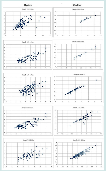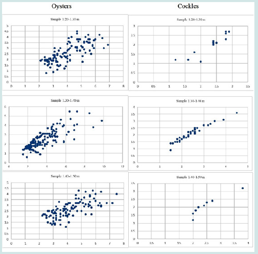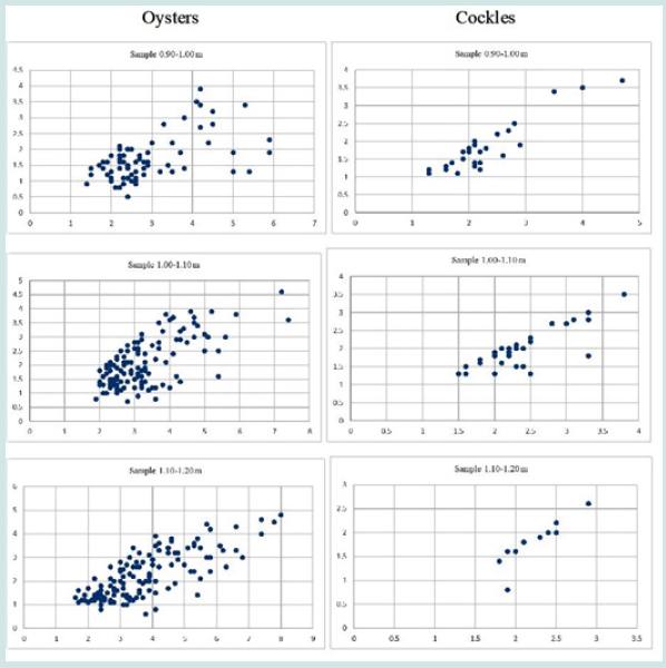 Figure 4: Scatter diagrams of Middle Holocene oysters and cockles’ shells size (Source: Holl 2022).