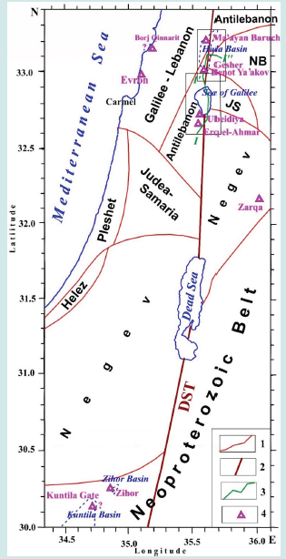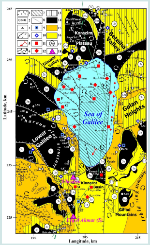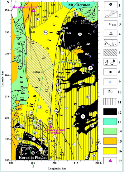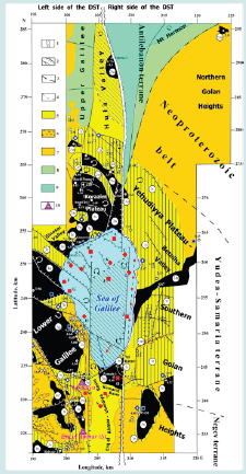 Located south of the Hula Basin, the more extensive and intensively submerged Kinneret-Kinnarot Basin (Figure 1) extends south to the Dead Sea. It is underlain by a powerful salt-bearing Miocene sequence [51]. According to paleomagnetic mapping data, the older basaltic series of the zone Sogdiana-2 dominate (Figure 7). Their radiometric age ranges from 17.7 to predominantly 3-4 Ma, corresponding to the 5Cr - 3n subchrons of the standard Miocene-Pliocene magnetostratigraphic scale. The most extensive outcrop area is subchron 3n, developed in the Lower Galilee and the Korazim Plateau, and subchron 3r outcropping on the Golan Plateau and partly to the west of the DST. Many authors note the extremal complex tectonic mosaic structure of this area [16,19,34,56,57,60,63].