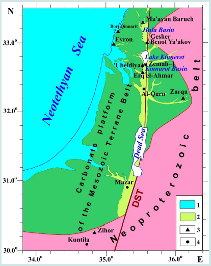 Figure 2: A simplified tectonic-paleogeographic map of the Levantine region for the Gelasian-Akchagylian time of the maximal flooding. (1) areas covered by the Gelasian Sea of Neotethys, (2) areas of the development of alluvial and lacustrine facies of the Gelasian stage, (3) location of the archaeological sites of the ancient hominins considered in the presented study, (4) location of geological sections Kuntila and Mazar (southern Israel), and Zemah-1 borehole (northern Israel) significant for the radiometric, stratigraphic, and paleomagnetic correlation. DST, Dead Sea Transform. Symbol ‘?’ indicates insufficient knowledge of geological-archaeological data.