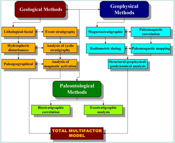 The study of such complex ancient anthropological sites requires their analysis using the integration of reliable, comprehensive methods. The variety of geophysical, geological, and paleontological methods (including compilation results) employed in this investigation are presented in Figure 3. For the first time, in the region under study was used a combined analysis of physical (radiometric, magnetostratigraphic, paleomagnetic correlation, paleomagnetic mapping, and geodynamical analysis), geological (lithofacies, event stratigraphy, hydrospheric disturbances, cyclic stratigraphy, paleogeographical, magmatic activations, and palinspastic reconstructions), and paleontological (biostratigraphic correlation and ecostratigraphic analysis) methods.