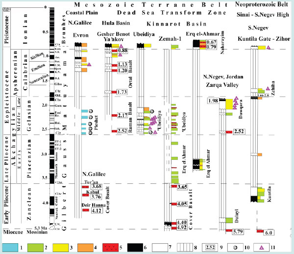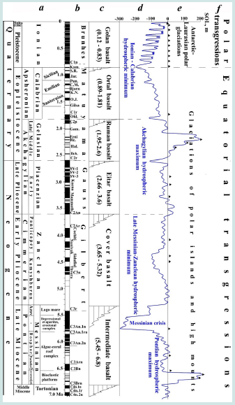 In this paper, for the first time, we point out that these cycles of the Levant trap series coincide completely with the latest Cenozoic stages identified in marine sections of the Mediterranean. Intermediate Basalts correspond to the Messinian Stage, Cover Basalts to Zanclean, Eitar Basalts to Piacenzian, Ruman Basalts to Gelasian, Ortal Basalts to Calabrian, and Golan Basalts to Ionian (Figure 4c). The presented correlation has significant importance since the wide volcanism’s development in the Levantine corridor has influenced the dispersal of the early hominins from Eastern Africa. These data will be used later for constructing paleomagnetic columns and maps.