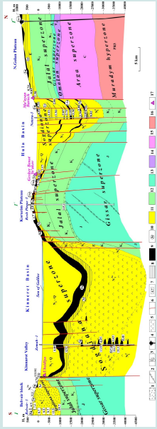 Figure 8: Paleomagnetic profile Kinnarot Valley – Lake Kinneret – Hula Valley (its location is shown in Figure 1) (based on [19], with supplements). (1) basic traps, (2) basic dykes, (3) gabbro, (4) volcanic cones, (5) evaporite sediments, (6) faults, (7) radiometric dating, (8) reversal polarity, (9) normal polarity, (10) indexes of Pliocene-Pleistocene magnetostratigraphic scale, (11) Sogdiana superzone, (12) Jalal superzone, (13) Gissar superzone, (14) Omolon hyperzone, (15) Arga hyperzone, (16) Moradym hyperzone, (17) ancient hominin site. The primary utilized sources (besides publications presented in the captions for Figures 6 and 7) are [19,63].