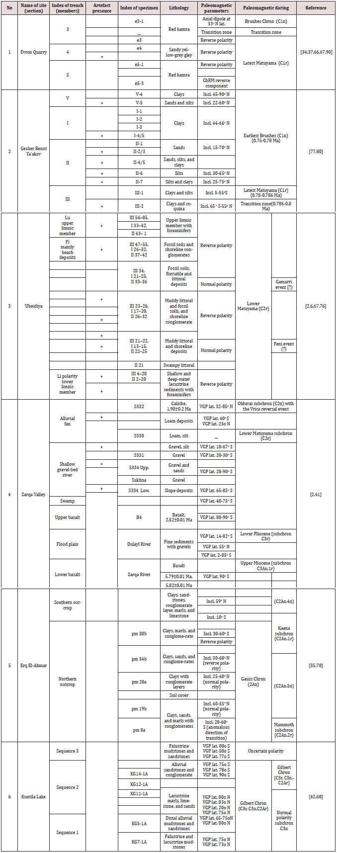 Generalization of paleomagnetic parameters observed in the anthropological sites (outcroppings) in the northern part of the Levantine Corridor. It is well-known that the ecostratigraphic nature of deposits is associated with subaqueous and subaerial sedimentation settings. Such a combined analysis, undertaken for the first time as a correlation criterion for the Late Cenozoic sections of the Levant, makes it possible to separate the stages and zones of active sedimentation and the zones and epochs of tectonic-thermal activity that oppose them. These zones and stages reflect the critical phases of the existence and evolution of ancient hominins. Meanwhile, facies and ecostratigraphic analysis of the Levantine sections with artifacts has confirmed the geomorphological and paleogeographical data on alternating stages of hydrospheric disturbances and associated periods of humidification and drying [14].
