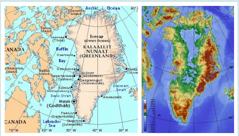 Figure 1: Greenland in its geographical context (left) and beneath the ice sheet that currently covers much of it (right).