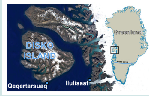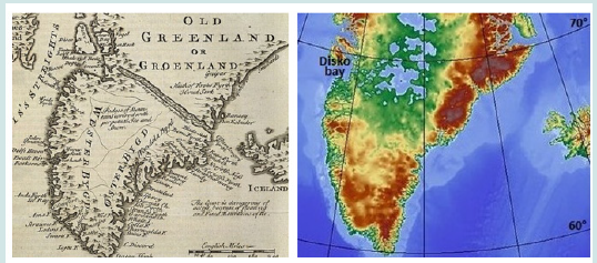 Figure 2: An image of Disko Bay, with the island of the same name, and (on the right) its location exactly in the Centre of the west coast of Greenland, right where the central plain reaches the sea, as Plato states.