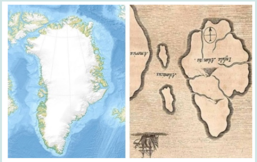 Here the comparison with the profile of Atlantis in the map by Athanasius Kircher (a German Jesuit of the 17th century) comes naturally, showing an enormous island, located in the Atlantic, with a vaguely ovoid profile with the tip pointing south, which presents a remarkable similarity to that of Greenland (Figure 7). Incidentally, in Kircher’s map the north is indicated downwards; therefore, to compare it with Greenland it is best to overturn the map so as to bring the north upwards.