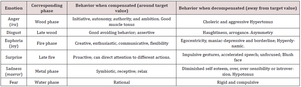 In terms of vegetative action, in the yang phases, sympathetic functions dominate more than in the yin phases whereas in the yin phases, parasympathetic activity is relatively more present (Figure 1) [13,15]. The application of this cybernetic model to the autonomic nervous system, results in a categorization of “organic patterns” called “orbs” (equivalent to Zang-Fu), a physiological response with neurovegetative origin [15,16]. In TCM, each “orb” is related to regions of the body, a somatotopic representation. Thus, each “phase”, “orb” and the corresponding emotion, will manifest itself in accordance with its characteristics in different somatotopic areas of the body, which reminds us of Carl G. Carus’ theory about constitutions. Therefore, TCM is essentially based on a system that describes functional anomalies through the analysis of signs and symptoms that arise from neurovegetative activity, also reporting the bio-psycho-behavioral activity (Table 1). The HM of TCM conceptualizes emotions as neuro-emotional vectors of the “phases”, which reflect a vegetative experience of being, exerting a network role in the overall of mental impulses [13,15,17] where emotions consist of vectorial movements arising from the center, (“e-motion”) expressing a certain “phase”, a vegetative functional tendency (Figure 2) [13]. Moreover, an emotion is the component that comes out of actions, whereas a feeling is the component that comes out of our perspective on those actions [13]. In addition, emotions are an integral part of reasoning and decision-making processes [18,19]. Paraphrasing, Henry Greten (2012), “emotions are vectorial movements that reflect the vegetative experience of being, and in turn interact globally and dynamically with neuro-cortical impulses” [20] (Figures 2 & 3). Within this system of the phases, a coordinate system of emotions can be elaborated (13), a two-part system of behavioral action and inhibition may be discriminated (Figures 2 & 3) as well as the analysis of compensated or decompensated behavioral manifestations of each “phase” (Table 1).