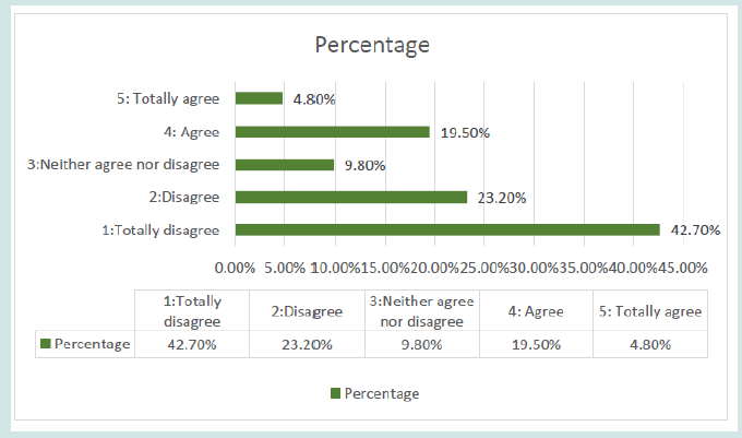 Figure 23 The most frequent answer is 1: totally disagree with 30, 1%. Then the answer 2: disagree with 22, 9%. The next answer is 4: agree with 19, 3%. Then, the answer 3: neither agree nor disagree with 14, 5%. finally, the answer 5: totally agree with 13, 2%. Figure 24 The most frequent answer is 4: agree. Following by answer 3: neither agree nor disagree with 21, 7%. Then the answer 1. Totally disagree with 20, 5%. The next answer is 2: disagree with 18%. At last, answer 5: totally agree with 13, 3%. Figure 25 The most significant answer is 4: agree with 39%. Then answer 5: totally agree and answer 1: totally disagree, both with 18, 3%. The next answer is 3: neither agree nor disagree with 14, 6 %. Finally, the answer 1: totally disagree with 18, 3%.