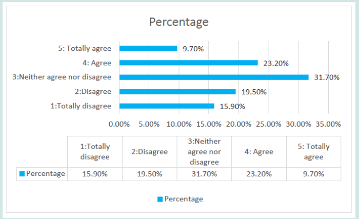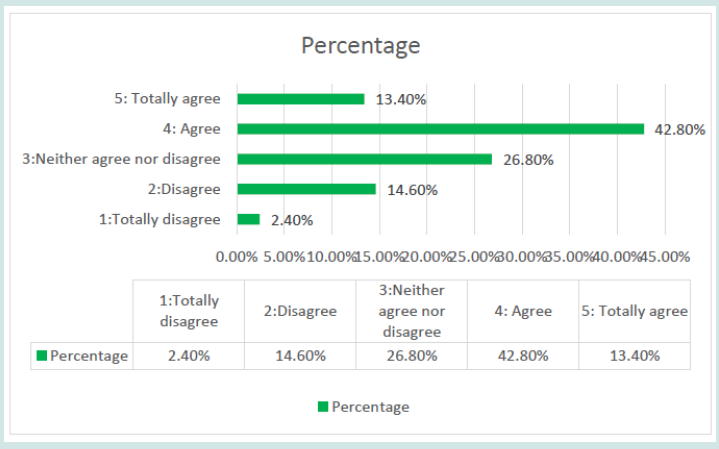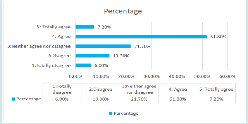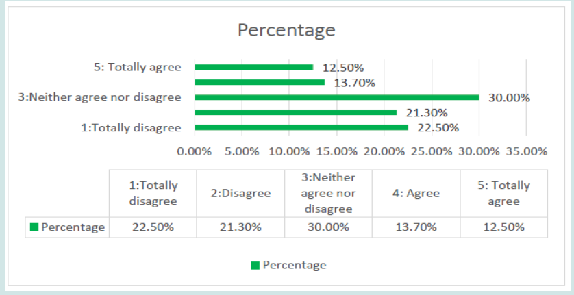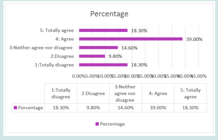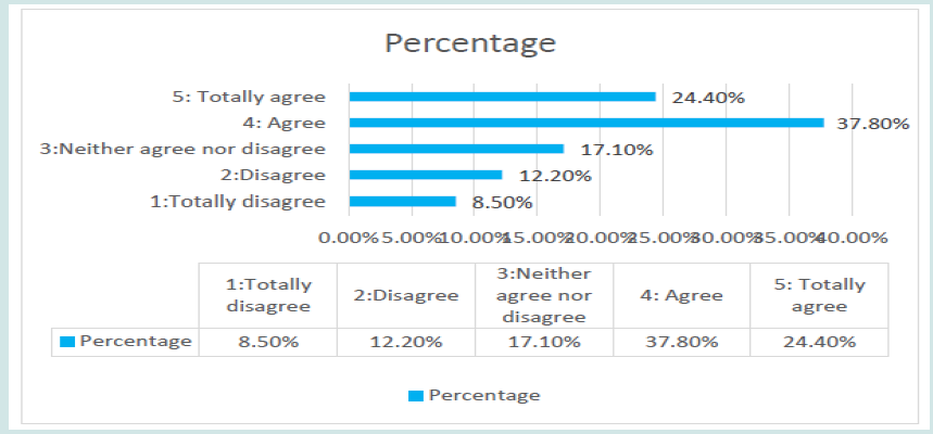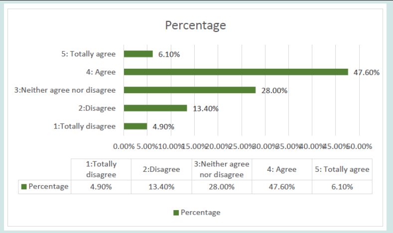(Figure 5) The highest percentage is in the answer 4: agree. Then in the answer, 3: neither agree nor disagree with 24, 1%. The next percentage is 2: disagree 20, 5%. At last, the answer 5: totally agree with 14, 5%, and 1: totally disagree: 10, 8 %. (Figure 6) The first significant percentage is the answer 4: agree with 27, 7%. Then the answer 3: neither agree nor disagree with 26, 5%. The next on is the answer 2: disagree with 20, 5%. The less significant are the answer 1: totally disagree with 13, 3%, and answer 5: totally agree with 12%.