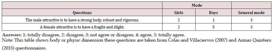 In physic dimension, girls and boys disagreed with men`s attractiveness related to be robust an vigorous. In addition, girls disagreed with female´s attractiveness referred to be fragile and slights. Only boys, agreed that female are attractive because of fragile and slight characteristics. There is inequality in physic dimension, and more in boys’ conception about female physic. In the dimension of social behavior, girls and boys disagreed to show rudeness. Then in the next question, girls disagreed to show sweetness and affection, however, boys agreed with this item. It could be because currently sensitiveness of boys is more accepted in public. In skills dimension, there is a significant inequality, also there are different points of view between girls and boys.