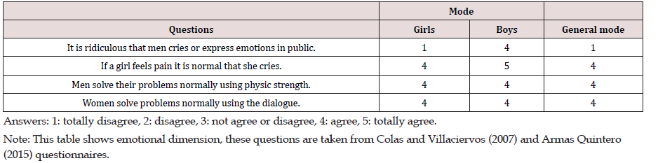 Girls disagreed that women are better in specialties associated in personal care and social services. However, boys agreed with the affirmation. According to the affirmation that boys are better in informatics, electronic, industry and architecture, girls disagreed and boys agreed with this. In emotional dimension girls disagreed with the idea that men can’t cry or express emotions in public. But, boys agreed with this idea. There is a difference between genders in emotional expression. In addition, girls and boys agreed that women cry when they feel pain, likewise, they agreed that men solve problems using physic strength. In the last questions, girls and boys agreed that women solve problems using the dialogue. There is a significant difference between boys and girls in their emotional expression, women can cry, also they solve problems with dialogue. While, boys use strength to solve problems, and according to boys perception they can’t cry. In the affective expression dimension, girls neither agreed nor disagreed with the items related to women can kiss or hug or express their feelings and men cannot. While boys agreed with the item, that means that boys thought that women are able to hug and kiss in public and men can’t. In the question about women can take hands of their friend and men can’t, there was a significant different between girls and boys. Girl didn’t agree with this unequal affective expression, however boys agreed with the idea that women can take their hands, but men can’t. In the next item girls neither agreed nor disagreed with the affirmation that women are able to comfort people. While, boys agreed with that, they though that women can comfort people when they feel sad. That means that in this dimension boys perceived more inequality. In the last questions boys and girls agreed that men have a competitive attitude and girls have a predisposition to love. That means that both groups accepted there is a different expression in gender roles.