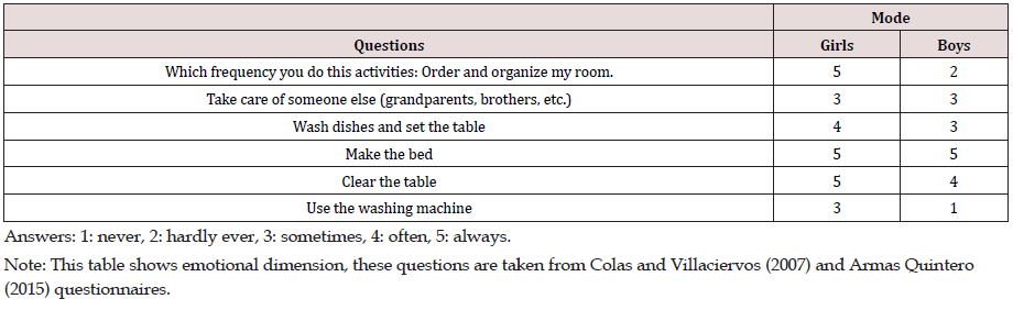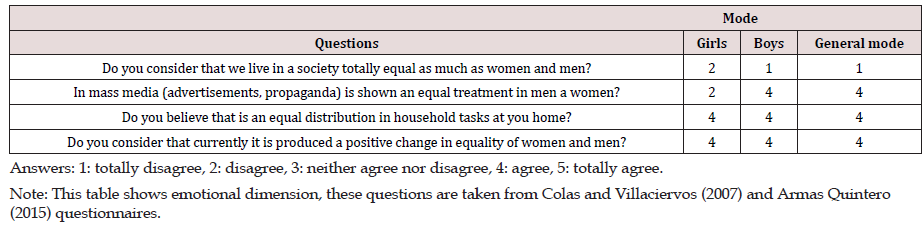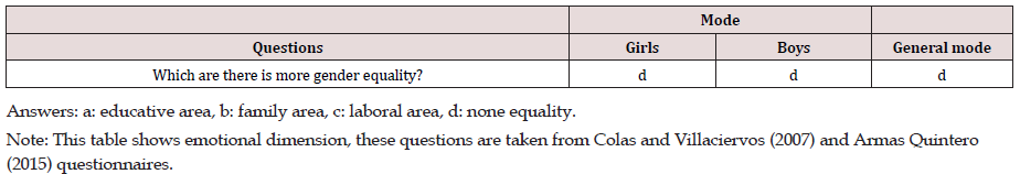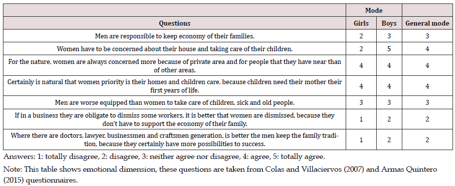 (Table 3) In the first question of skills dimension, girls disagreed that women are better in specialties associated in personal care and social services. However, boys agreed with the affirmation and though that girls are better in those professions. In the second question, girls disagreed with the affirmation that boys are better in informatics, electronic, industry and architecture. In contrast, boys agreed that they are better in those professions. The general mode is 4 agree, that means that they perceived skill inequality between women and men.