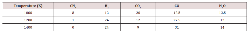 Table 2: Syngas production (kmol/ton of biomass) at various Temperatures (K) and Pressure of 24 atmospheres.