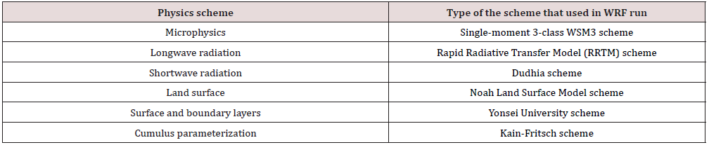 Several studies indicated that the configuration and scheme selection into the NWP model for wind simulation is regiondependent [31-35]. In a while, the initial and lateral boundary conditions, the model spin-up time [36,37], the parameterization of the influence of turbulence on wind velocity components [38] and planetary boundary layer (PBL) schemes [39] are the main dependant factors for the low-level wind’s accurate simulation at high resolutions in the NWP models. Therefore, a set of configurations in the NWP model must be determined for mapping the spatial wind resources [40,41] studied the effect of four modifications to the WRF model during eight simulation experiments. The modifications included Radio occultation data assimilation, different versions of the WRF model, utilizing bulk microphysics schemes that have been established in the period from 1983 to 2011, and completely coupling WRF to the ocean dynamic model. The accuracy of the simulation has been evaluated through a comparison between each simulation to the Global Forecasting System (GFS) model analysis [42], studied the evaluation of nonconvective wind forecasting methods in the 15th operational weather squadron area of responsibility.