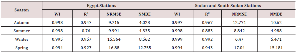 From a statistical point of view, the results in a Table 6 indicated that the predicted wind speed values were close to the measured ones. The goodness of fit test revealed a significant convergence between the measured and predicted values. Where R2 and WI values are closer to 1 for all seasons except summer in Egypt, Sudan, and South Sudan. While the NRMSE values ranged from 9.715% during autumn to 16.880% during spring in Egypt and from 6.470% during winter to 17.040% during spring in Sudan. Furthermore, NMBE values simulated the same behavior of NRMSE with maximum bias during spring in Egypt, Sudan, and South Sudan with 12.755% and 15.181% respectively. These results are confirmed in Tables 4 & 5. The results in Table 6 showed that the best goodness occurred during autumn in Egypt and winter in Sudan and South Sudan. While the lowest correlation between observed and predicted wind speed was during summer in Egypt, Sudan, and South Sudan. It was noticed that there are no significant differences between the observed wind speed and the WRF forecasts during all seasons, which confirms that the WRF model success and has a good ability and high performance to simulate and predict wind speed during the different seasons over the three countries.