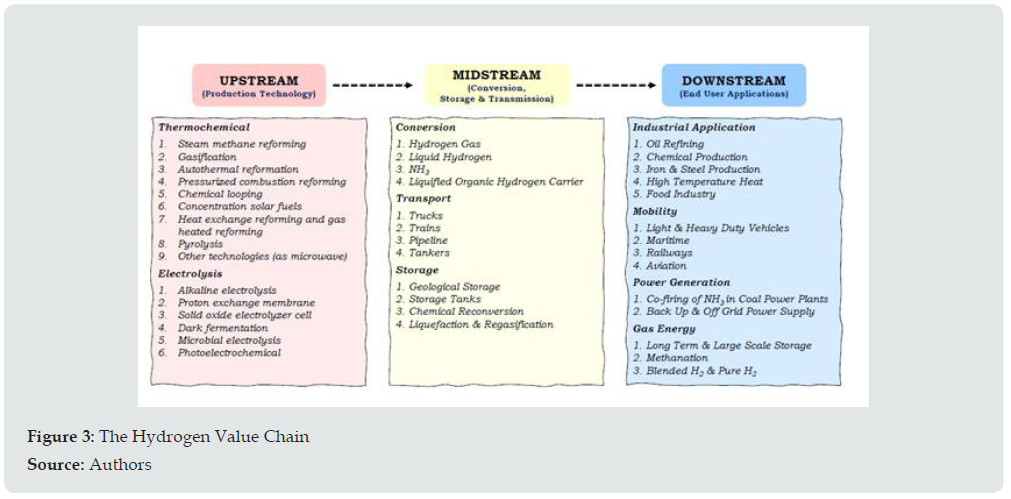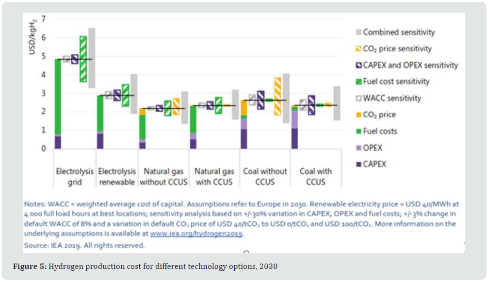 There are various sources and technologies available from which hydrogen can be produced. Hydrogen can be produced from several alternatives like fossil fuels, water, biomass, a mix of biomass, and water. About 275 Mtoe (Metric tons of oil equivalent) of energy is required for the production of hydrogen [4]. A significant amount of CO2 emission is generated when hydrogen is produced from natural gas and coal. While Figure 3 depicts the Hydrogen Value Chain, Figure 4 gives the various pathways for producing hydrogen. Currently, steam methane reforming is least expensive method for production of hydrogen, and it accounts nearly all commercially produced hydrogen. Emission reduction can be achieved with the usage of CCUS (Carbon capture, use and storage) technology when hydrogen is produced from natural gas and coal. Table 2 provides details for various methods for producing hydrogen along with its advantages and disadvantages. In the near term, the advantage of fossil fuels cost is likely to continue in the majority of the places in the world. Hydrogen from the natural gas without CCUS technology would be cost in the range of $ 1-2 per kgH2, depending upon the local natural gas price. Figure 5 gives the details regarding the cost of various technology options for producing hydrogen in 2030 [5].