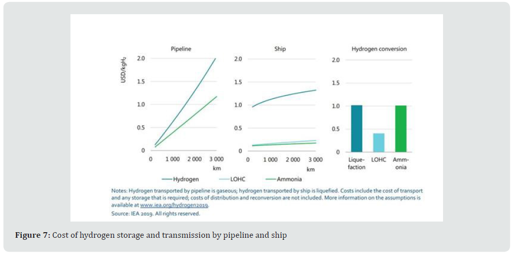 Hydrogen can be stored in large quantity for a long period of time and can be transmitted over long distances which make hydrogen play an important role in the development of a cleaner energy system. Hydrogen can be stored in gaseous and liquid forms. Figure 6 gives the various elements of the collection, transmission, and distribution of hydrogen. Hydrogen storage and transmission is a complex problem that requires intense research. The main issue is the low density of hydrogen gas [6]. The potential hydrogen storage system includes a compressed tube trailer, liquid storage tank, and compressed gas pipeline. Each alternative requires a high capital cost. Table 3 gives details about the storage options for hydrogen. Figure 7 gives the details about the cost of hydrogen storage and transmission using pipeline and ship, and the cost of hydrogen conversion [7].