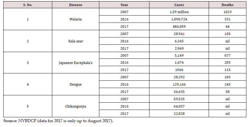 Millions of Indians are at the risk of becoming nutrient deficient by 2050, as rising levels of carbon dioxide (CO2) are making staple crops such as rice and wheat less nutritious [3]. So far, a decline between 10 to 14 % is seen. Researchers at Harvard TH Chan School of Public Health also found that India would bear the greatest burden, with an estimated 50 million people becoming zinc deficient. As many as 38 million people in India are at the risk of becoming protein deficient, and 502 million women and children becoming vulnerable. Child stunting is projected to increase by 35% by 2050 compared to a scenario without climate change. This research notes that decisions we are making every day -- what we eat, how we move around, what we choose to purchase -- are making our food less nutritious and imperiling the health of other populations and future generations. Rising temperature has significantly influenced the spread of vector borne diseases in the country. Dengue and Chikungunya have been on the rise, burden of Malaria has shown a slight decline for now (Table 1).