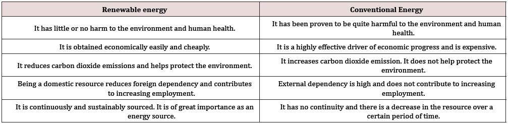 The energy problem is the biggest problem in the world and this problem continues to grow day by day. Increasing population and developing technology constantly demand more energy. Today, in many countries, mainly coal, oil and natural gas are used for energy. It is possible that these resources will be limited and will run out in the future. These resources, called fossil fuels, are not renewable. Humanity meets the energy it needs by converting various natural resources into energy. Today, the use of renewable energy sources among energy sources is constantly increasing. Renewable energy is generally defined as energy sources that can be supplied mostly above ground and continuously renewed without the need for any production process. It is a type of energy obtained from the energy flow that exists in natural periods. Unlike conventional energy sources, renewable energy sources provide many environmental benefits. In Table 1, renewable energy and conventional energy are compared.