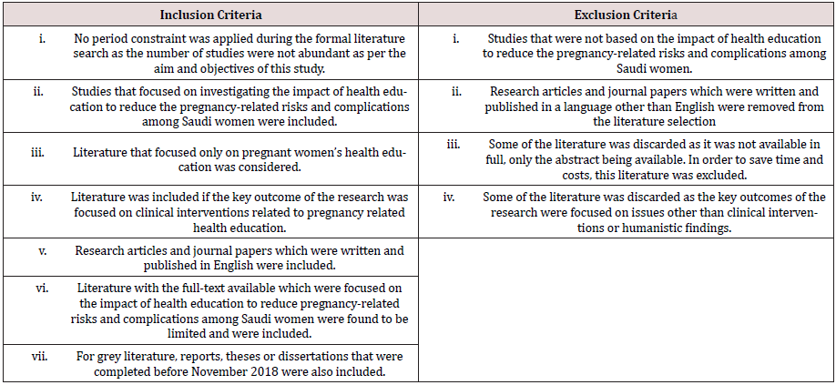 After finalising the research title, a preliminary literature search was conducted using the “Medical Literature Analysis and Retrieval System Online (MEDLINE) database”. The main purpose of this literature search was to identify relevant articles and research studies related to different sorts of pregnancy related complications and health issues, the impact of health education in preventing complications among pregnant women and current practices for promoting health awareness among pregnant women in Saudi Arabia. From the database search for relevant literature it was found that much research related to clinical interventions aimed at reducing particular risks during pregnancy has been carried out; however, literature pertaining to understanding and analysing the impact of health education on reducing pregnancyrelated risks and complications among Saudi Women by raising their awareness and enhancing their self-monitoring behaviour is not abundant. As a result, this research project will focus mainly on the impact of health education to reduce pregnancy-related risks and complications among Saudi Women. During the database search for relevant literature, important keywords or subject headings were identified which were later used in the formal, systematic search of the literature for the literary review of this study.