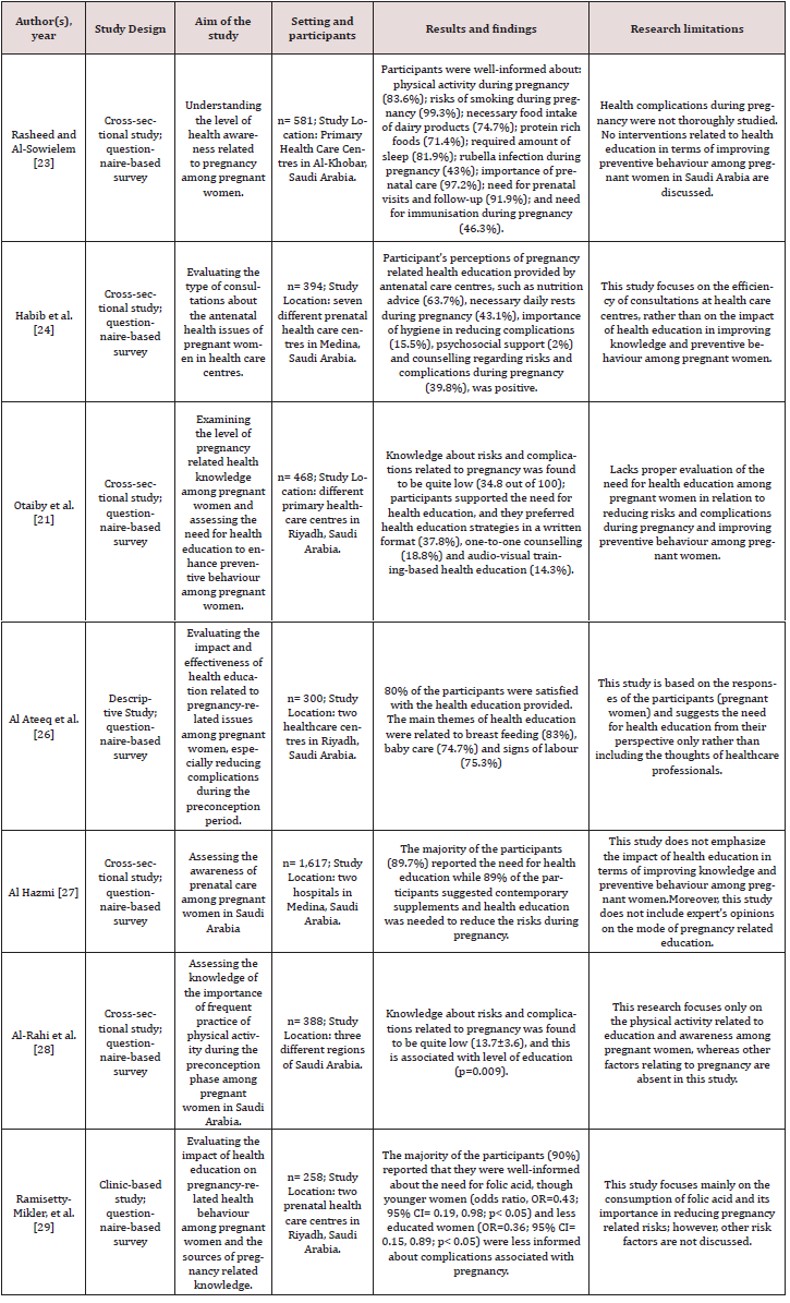 Studies and clinical research conducted to understand the impact of health education during pregnancy to improve the knowledge and increase the preventive behaviour of pregnant women in Saudi Arabia are very scant [22]. Although a few studies have been carried out on the health management of pregnant women in Saudi Arabia, these have not especially focused on the impact of health education on improving self-awareness, understanding about a healthy lifestyle and minimising the risks and complications related to pregnancy. Therefore, this study aims to review the existing literature to understand the impact of health education for pregnant women in Saudi Arabia in relation to promoting a healthy lifestyle during the preconception period as well as reducing the associated risks and complications which are common throughout pregnancy.