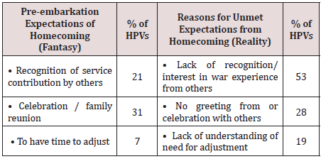 • The HPVs’ met and unmet expectations of homecoming and who was the most likely to have experienced the latter.