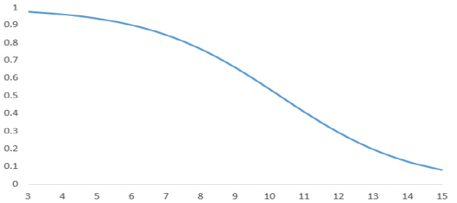 Applying the proposed model in equation (1), the following estimated probabilities of poor neurological outcome are obtained for the different GCS values at discharge from ICU: GCS at discharge from ICU 3: 0.978 probabilities of poor neurological outcome, for 4: 0.963, 5: 0.939, 6: 0.902, 7: 0.846, 8: 0.766, 9: 0.662, 10: 0.538, 11: 0.410, 12: 0.293, 13: 0.198, 14: 0.128 and 15: 0.081 (Figure 2). The goodness-of-fit of the proposed model is moderate, around 36% obtained from the Nagelkerke R2.